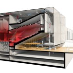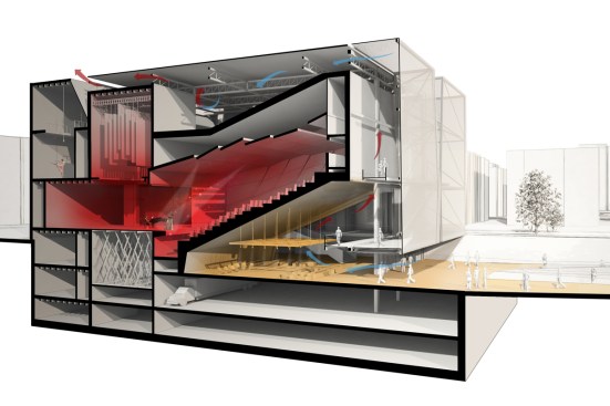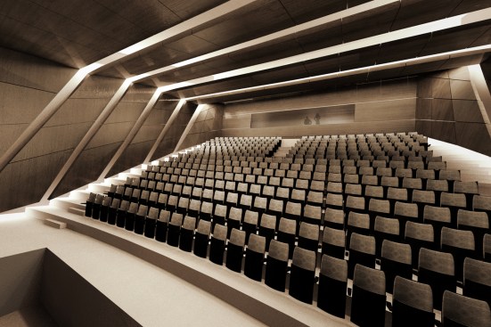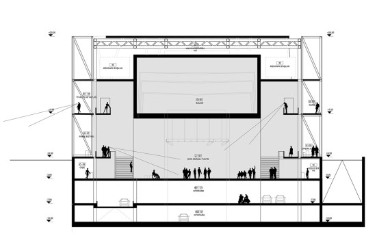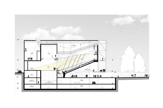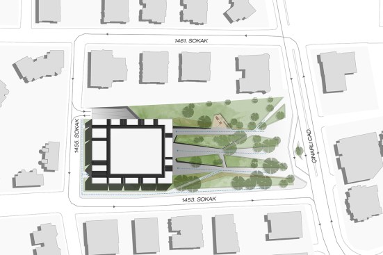 Required spaces are organized in a way that allows the multi-purpose foyer to open up to the trees, the children and the voice of the street in the direction of park while locating the opera hall, the entrance for the artists, the rehearsal rooms, the studios and workshops in the southern part of the building. Therefore the building is shaped to fed from the daily life of the neighborhood.