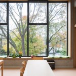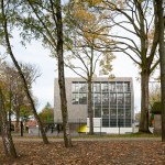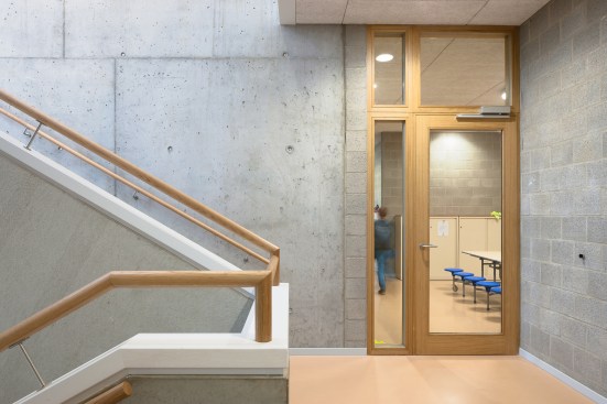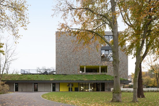 The tower building has been clad with brown natural slates – disappearing into the treetops. The north façade has wide open windows which provide daylight and spectacular views. The south façade has an individually controlled sun protection by means of horizontal louvres. The inside finishing are exposed concrete and masonry in contrast with warm tactile wood [oak]. All floor colors are typical per floor and are naturally orientated.
