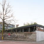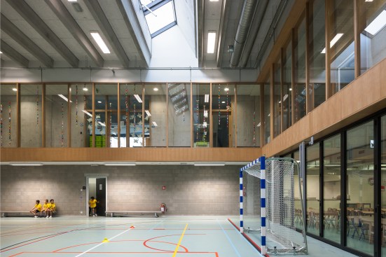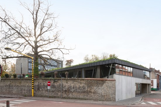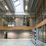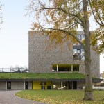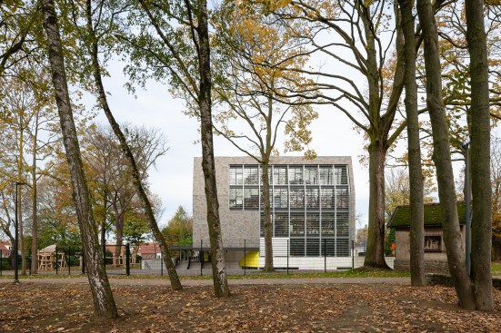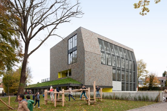 A new school in the city park of Zaventem. The design idea is to plant the building as modest as possible on the site to preserve the existing trees and green space. The location of the building is determined by giving solution at the least pleasant edge zone of the park. The park gets a new ‘hoek’ [angle]. The building becomes an extension of the park by a dubious play of inside/ outside bounderies. The major impact of the sports hall is minimized by using the existing difference in level [street versus park]. The lower part of the building [toddlers area] has its own playgarden with a big canopy. The tower part is destinated for students and has a strong north – south orientation. The – half underground – refectory and gym can be merged into one big polyvalent space. The roof of the lower building is covered with peat [norwegian ‘torvtak’]- the first one ever created in Belgium. This roof garden gives opportunity to organise outdoor classes on the roof.