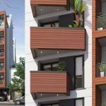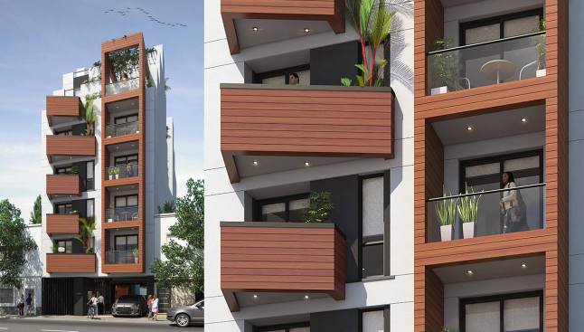 • Materials: The building will be constructed with RETAK (thermal bricks), a concrete structure, and white plaster finishing. Wooden balconies have been added to the white envelope in two different shapes “inclined isolated” and “combined porches”, and black aluminum carpentry, all of it creates a clean and tensioned stepped silhouette.