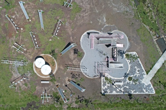 A partially contaminated water stream has been transformed into a river allowing a slow drop watering system for tvegetation and articulating the different sections of the park, which have been designed according to the activity and the users’ age, to foster family gatherings and the integration of the community.