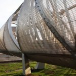 The heart of this green idyll is the Pasarela del Arganzuela – a footbridge designed by France’s star architect Dominique Perrault. The tapering conical forms on both sides of the bridge, wrapped in stainless steel Escale mesh manufactured by the internationally leading technical weaver GKD – Gebr. Kufferath AG create a shimmering helix. The metal mesh surrounds the bridge from end to end in a spiral design like a textile ribbon. This helix, which gleams silver in the sunlight, is a metaphor for the increasingly close association between the two parts of the city separated by the Manzanares. At night, it is transformed by backlighting into a golden spiral, floating mysteriously above the river.