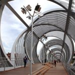 Two years ago Madrid celebrated the opening of the Centro Deportivo Multifuncional del Manzanares with its spectacular Caja Magica. Now, with the 820 foot Arganzuela Bridge, Perrault created a crossing for pedestrians and cyclists and an iconic structure for the Manzanares Park. Rather than a single compact structure, Perrault designed a self-supporting steel structure in two sections, tapering to cones at their outer ends. Pillars at the sides underline the impression of a floating link between the two banks. The two spiral-wrapped sections – 492 and 420 feet long – extend well into the park, meeting in the centre on a platform. It forms the entrance to the park, and a visible sign of the merging of the two parts of the inner city.
