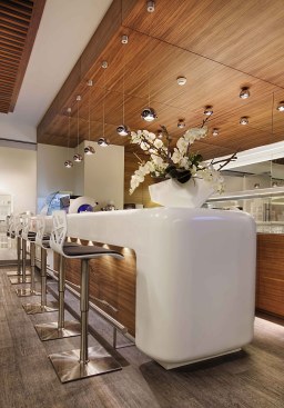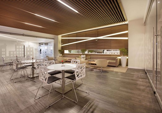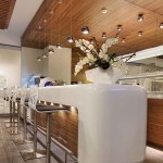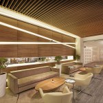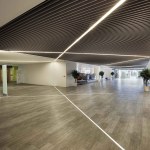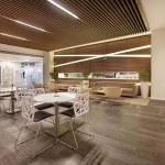Boytorun Architects, in addition to Passage Cafe, located at a point very close to the elevators and nested with the showrooms on the entrance floor of the building, also designed the common circulation spaces on the entrance floor in Süzer Plaza. In order to break the monotony of the corridors stretching out in a single piece, by means of the linear light lines mounted on the suspended ceiling, both the circulation axis have been defined and vitality has been created in the common areas. The linear trails of the lighting in the common area, which has gained a dynamic style through such an effective lighting, has also been reflected in the interior design of Passage Cafe.