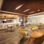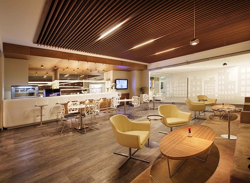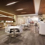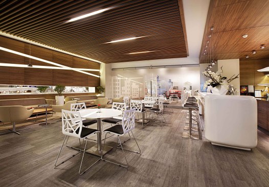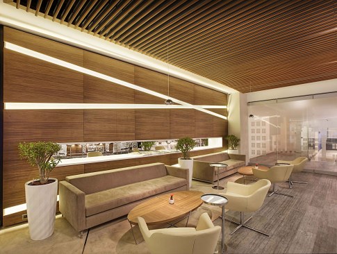Separated from the showroom areas by means of a film coated glass panel wall displaying the city silhouette, the depth perception of the space has been increased by complementing the assertive linear lighting on the wooden separator wall with a mirrored niche at Passage Cafe. Featuring an area of 200 m2 where wood is used intensely, the vivid flooring of Passage Cafe was produced specially in consideration of the flooring, dimensions and place.