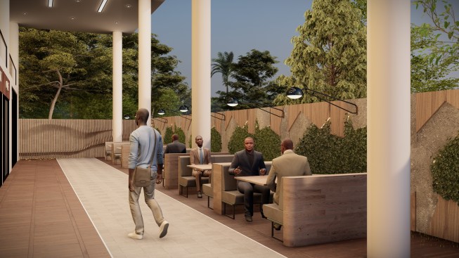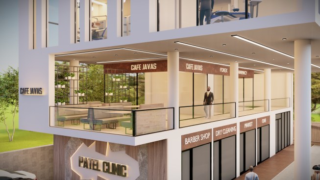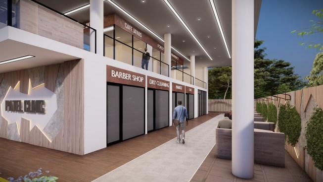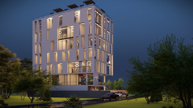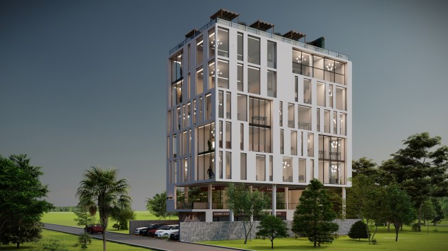 The project area is located in Kampala, the capital of Uganda. Plot area is 435 sqm. Plot dimensions are 15 m by 29 m. Main road side dimension is 15m. It was requested by the client to build a commercial function on the ground floor and a clinic on the upper floors. Plot dimensions are narrower on the ten fronts, and the plots are deeper longitudinally. For this reason, fewer commercial spaces are obtained when shops facing the main facade are built. This situation was desired to be overcome by evacuating the arena on one longitudinal side. The 2 storey high area was evacuated from the building and commercial shops were oriented towards this area, resulting in more commercial space along the longer plot. With its fast life cycle, Kampala hosts new constructions every day. In this crowded country with a population of 50 million, the need for buildings with social areas is increasing. This 2 storey high area was designed as a semi-open seating area for cafe and restaurant units and contributed to the ground floor relationship of the building. On these floors, there are general polyclinics, dentist units and management offices.B uilding is designed as 1718 sqm totally. 7 stores are designed on ground and first floor totally.5th and 6th floors are designed as apartments for doctor usings. There are 6 apartments totally on last 2 floors. Vertical circulation in the building is provided by 1 staircase and 1 elevator.The floor heights have been made as 350 cm and the maximum height of the building, which consists of ground + 6 floors, is 24.50 meters.