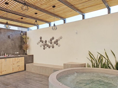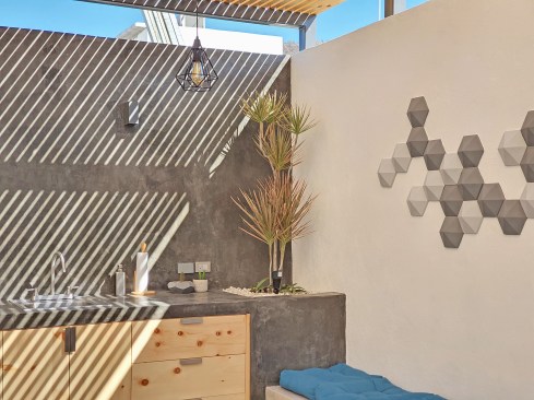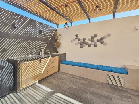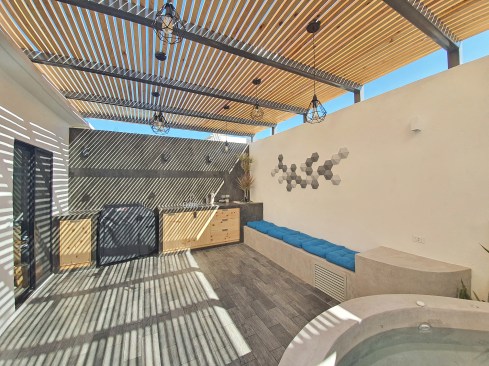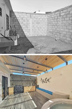 A renovation project that was designed for a small backyard in a house. Our clients wanted an open but safe place to hang out and relax. Sober finishes were used that contrast with natural elements such as pine wood, water and side gardens.