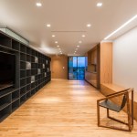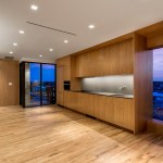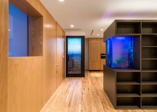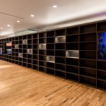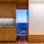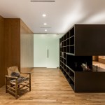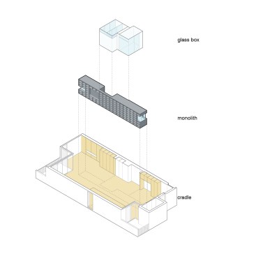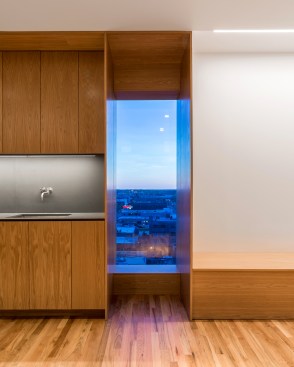 The client wished to transform his downtown Memphis condo into an exhibition space to house part of his extensive art collection. Three elements organize the 1,500 SF dwelling. The primary element is a charcoal stained oak veneer monolith of shelving, used to divide the space about the long axis, while also displaying the smaller artifacts within the art collection. This monolith is caped on one end by a fireplace and the other a fish tank. A cradle of lighter, contrasting oak veneer holds the space, wrapping up three of the four perimeter walls. This wooden cradle translates into an art viewing bench, the kitchen millwork, storage spaces for the office and bedroom, and built-in furniture. The restrooms are contained within a glass box impacting the directionality of the gallery/dwelling minimally. The small space features two balconies. The direction of the monolith, a linear light fixture in the living space extends the view, and minimal glass balcony doors help celebrate the exceptional views of Beale Street to the East and the Mississippi River to the West. Two smaller windows are thoughtfully framed, showcasing additional views of Memphis.
