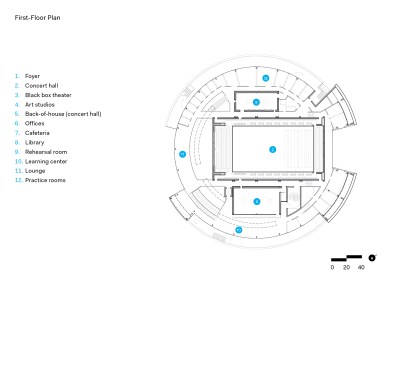Perhaps even more unexpected than the building’s shape are its modest materials: The structure is primarily poured-in-place concrete paneled with clear-finish OSB. Even the 900-seat concert hall, which can accommodate a full-size 120-piece orchestra, is lined with OSB panels.