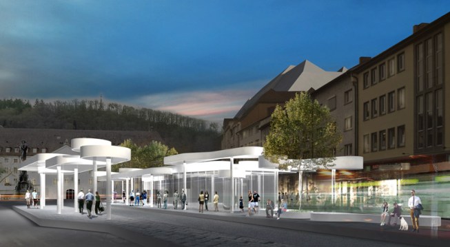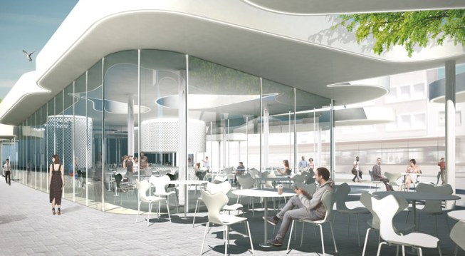 A new tram stop with a café will be built on Friedrichring at the edge of Freiburg's historical district. The roof's distinctive shape forms a striking contrast to other structures in the square, creating an attractive space for users of the city's local transport and other visitors to the city center. Upon historical triangular ground the curved roof shape emerges from a circular pattern. The stop's construction enhances the inner-city square, adding new appeal for Freiburg residents and visitors alike. The combined effect of the nearby Siegesdenkmal ("victory monument"), tram stop with pavilion and surrounding buildings creates a strong impression, offering a powerful entry to Freiburg's historic district.