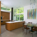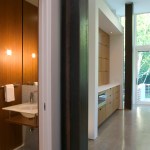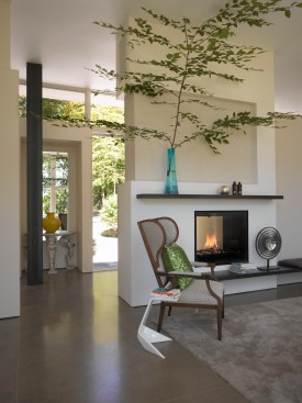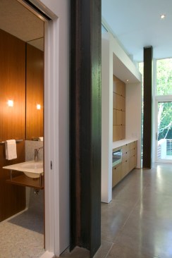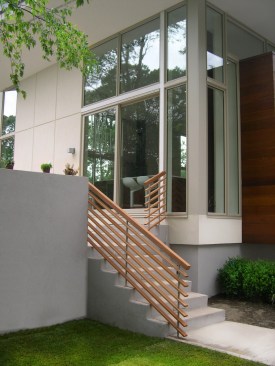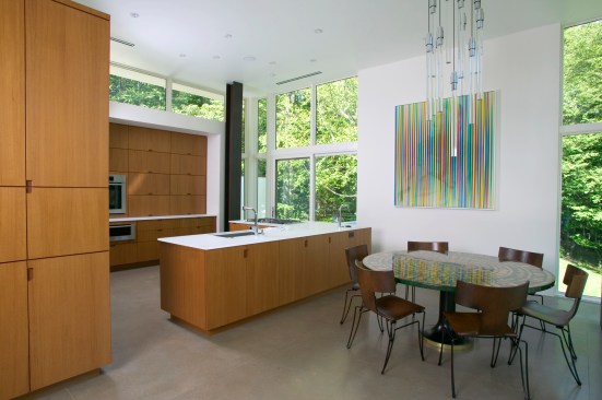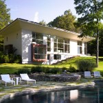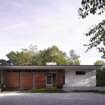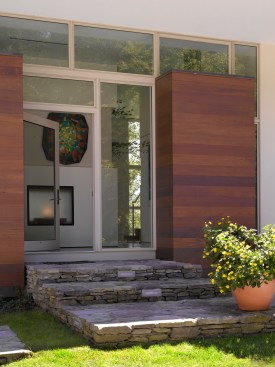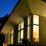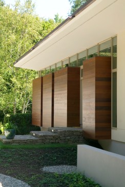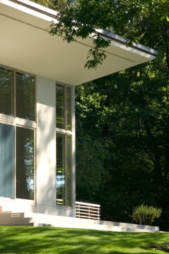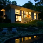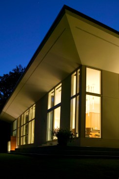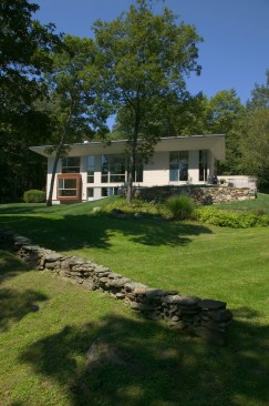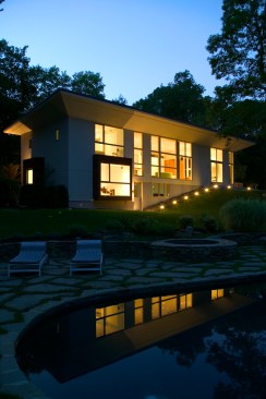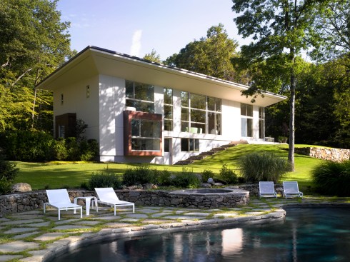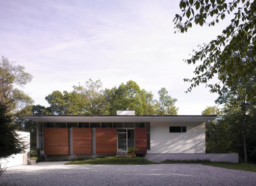 This 3,330 SF weekend getaway provides a private refuge for a NYC couple. The house sits on 5 semi-private acres. Its pavilion-like form nestles into a rise in the landscape allowing for the 2-story bedroom zone to seamlessly link with the main living areas, which contain living, dining, and kitchen functions. A dining terrace and a private master bedroom suite garden are defined as exterior rooms by concrete half walls that are extensions of the main house form. The gestural roofline slopes upward from the closed front facade to the more open rear facade and provides a sense of soaring relief as the occupant moves from the entry court to the expansive views beyond.