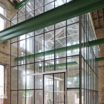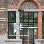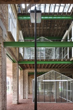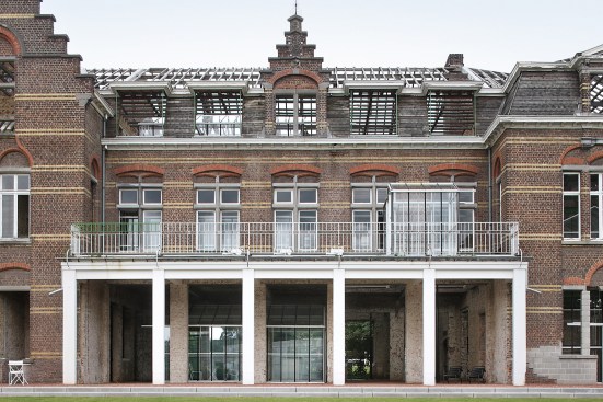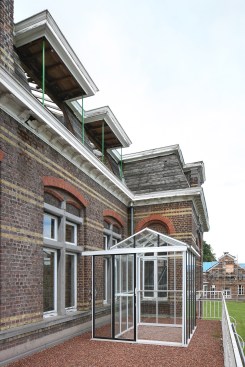 All mineral material has been removed so the rough building could breath again. The ground level was replaced by pebbles so water could drain in. Windowsills were lowered to open it in all directions. The basement was opened to become an auditorium. A tree was planted. Old chimneys became a fire place. And greenhouses were introduced as new rooms.