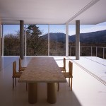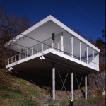 This house doubles as a studio for a photographer, built on a steeply sloping site which rises up from the road at a 45-degree angle. The client desired the maximum degree of transparency within a limited budget. A structural system was devised that used 300mm posts of pre-cast concrete to directly support the roof and floor slabs. The floor slab, at 9 meters above the ground, is made from laminated I-shaped wooden structures (10 meters long, spaced at a pitch of 5.5 meters), which rest on the surface of pairs of girders which connect the front and the rear precast concrete piles. The piles penetrate through the building introducing a visual contrast to the white floors and ceiling, which frame the views of the landscape. The south and east sides are fully open to the views with the use of glazed doors, and the north and the west sides are fitted with a double layer of translucent poly-carbonated panels.