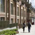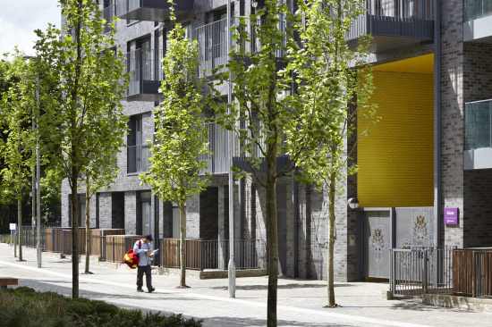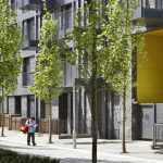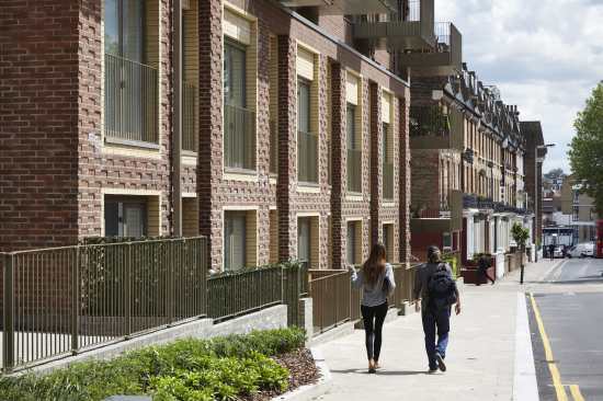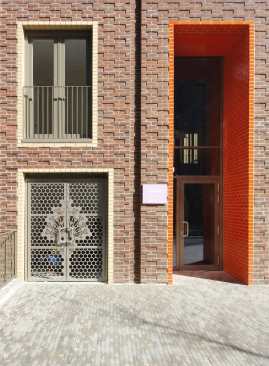 The architects referenced Edwardian neighbors with similar shades of brick and contrasting window surrounds. Three-story maisonettes at the base of the courtyard block, which face the historic structures, receive a more finely grained, rusticated articulation that implies a shared design vocabulary. Ground-level units have front and rear gardens as well, tying them to the typology of the older townhouses. The architectural language is starker and more modern along the new pedestrian avenue and in the interior courtyards. Communal entrances are easily identifiable via brightly glazed bricks.