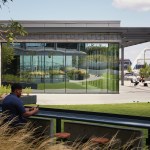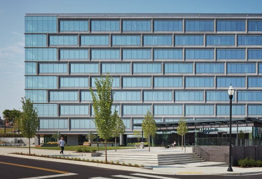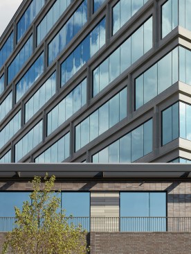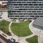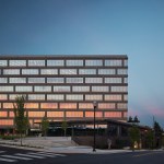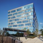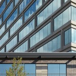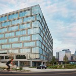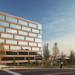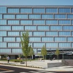 Patterned with precast concrete panels, brick, Oko skin, and glass, the façade is an everchanging reflection of the surrounding city. The façade pattern is derived from the organization of the adjacent historic trolley barns. The pattern erodes to all-glass corners at both the southeast and northwest corners to denote major entry locations.