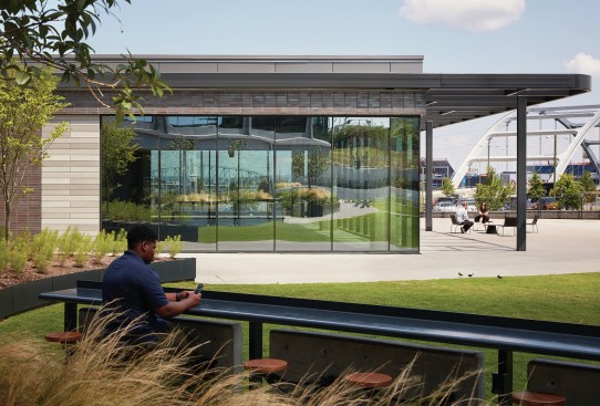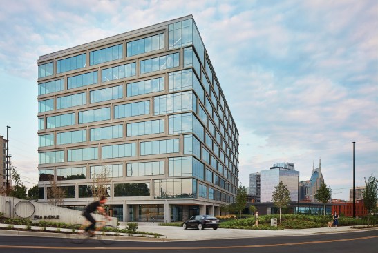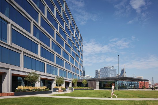 As part of a multi-site master plan, the design approach strategically buried a 1,005-car parking garage five stories below grade and positioned the building along the western edge of the site to create space for a pocket park. The 37,500-square-foot park anchors the site and, along with a promenade, establishes a pedestrian connection between SoBro and the Cumberland River Greenway. The north edge of the park is punctuated by an 8,000-square-foot restaurant space featuring patio dining that engages both the park and promenade.