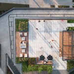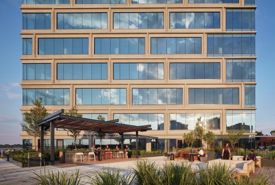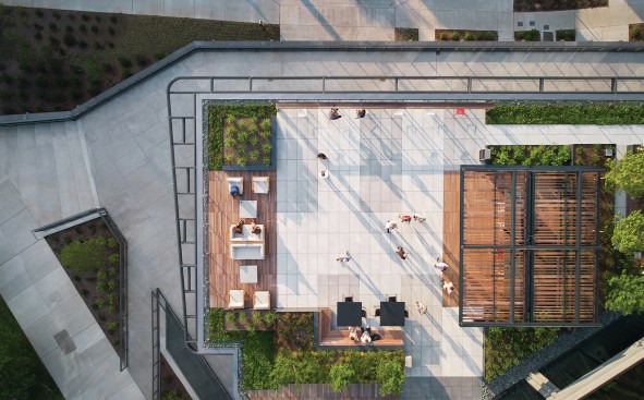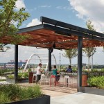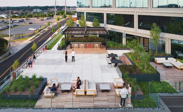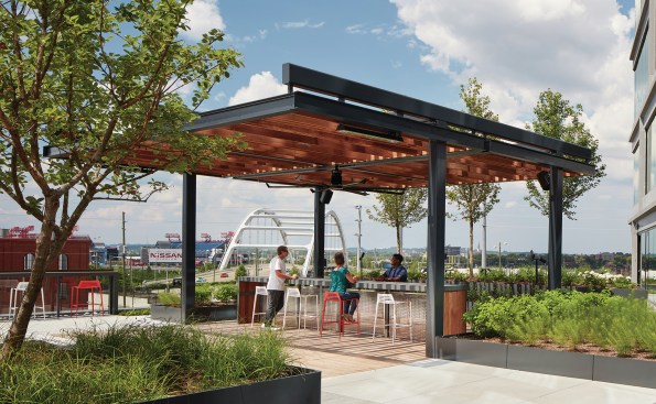 The 6,000-square-foot amenity deck at Peabody Plaza is oriented to capture views of the skyline and the Cumberland River. Designed to echo elements of the park below, the amenity deck also introduces 5,745 square feet of functional green roof which decreases heat-island effect, reduces storm water runoff, and improves storm water quality.