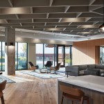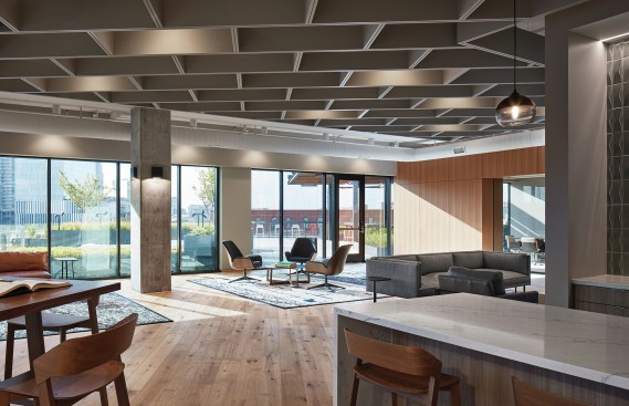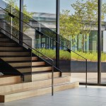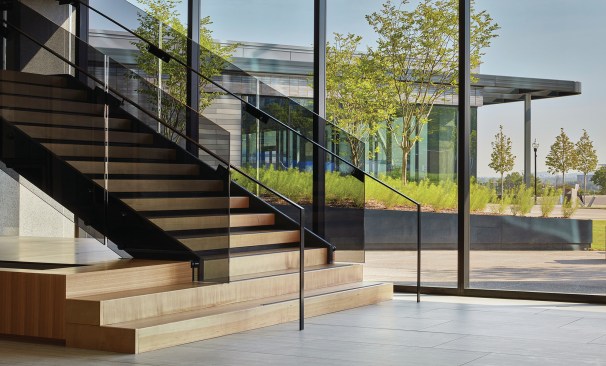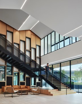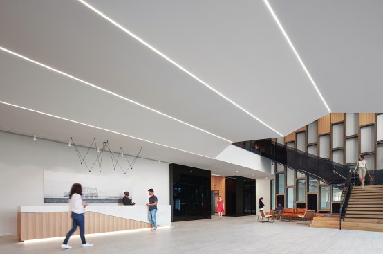 The lobby frames views of the pocket park while its angular ceiling recalls the undulating topography of the Rolling Mill Hill neighborhood. The monumental stair promotes healthy activity and is backdropped by a vertical feature wall that reinterprets the building façade.