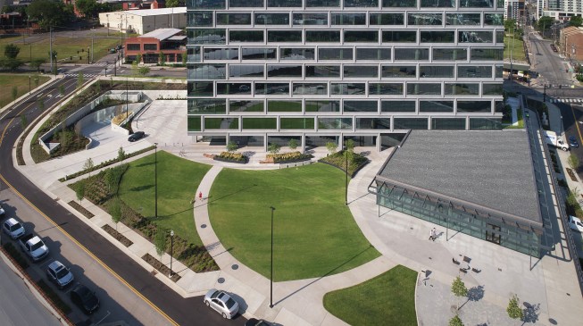 Located on a bluff overlooking the Cumberland River and adjacent to Ascend Amphitheater, Rolling Mill Hill is positioned in a vibrant live, work, and play neighborhood. Peabody Plaza replaces a 250-space surface parking lot to introduce a park and 290,000 square feet of office space with retail and restaurant opportunities enlivening the ground plane.