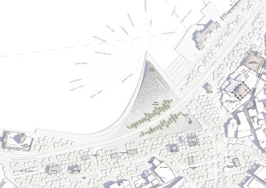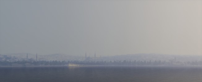 the triangle square derives from the prominent guiding lines of these three structures, referring to one another, and whirls itself into a slightly curved soaring plain especially with the intersecting winds that blow over “semsi ahmed pasha mosque”, and carved into a naturally sharpened point, which is also a symbolic gesture to the meaning of great architect’s name, grounding from several urban legends that hover over “mihrimah sultan mosque” as well as others, about how he values his clients’ names or vivid characters and reflect them in a metaphorical way of form, light, and solid void relation, etc. in his buildings. “the peak” generates a two-layered frame interrelated the waterfront and also the urban fabric.
