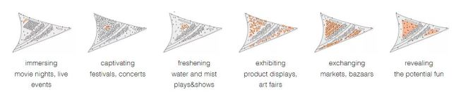 the triangle square explodes into its bits and pieces of smaller triangle modules and extends back to dissolve into distinctive urban elements, from seating elements to lighting and kiosks, playground elements to ticket sales and info nodes, spreading around the square, creating a new urban identity with an invisible connective mesh and integrating green areas, urban parks, transportation nodes, transition squares, and architects’ triangulated buildings with a smooth circulation and service priority of pedestrians.