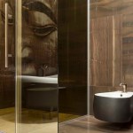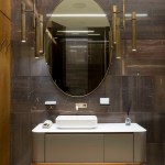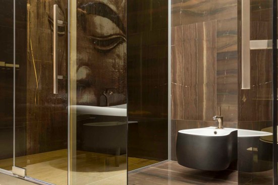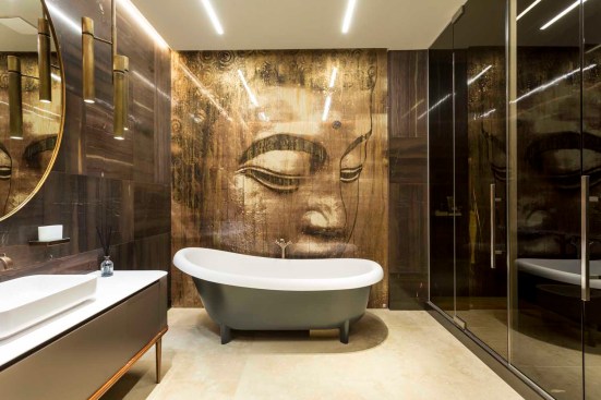 The bathrooms in the apartment are worth a separate word. The bathroom of the owners is designed in warm cognac and honey shades. The elegant room is decorated by an unusual panel with an image of Buddha, a work of a Portuguese designer Alex Turco.