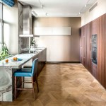 The kitchen is designed in minimalistic aesthetics. The atmosphere here is created by strict expressive wooden facades by Bulthaup and a massive stone element with mesmerizingly beautiful texture.