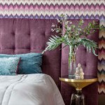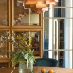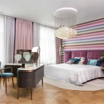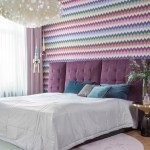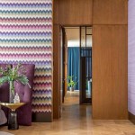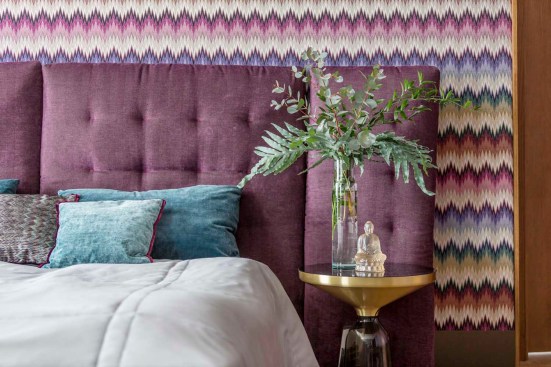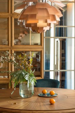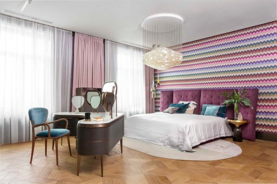 In the bedroom, the main color element that unites all objects together is a wall with colorful textile wallpaper. And an impressive Verpan chandelier (designed by Verner Panton) with mother of pearl plates on thin flowing suspensions completes the design.