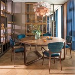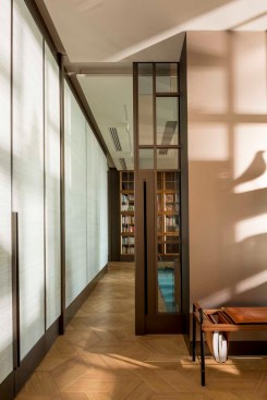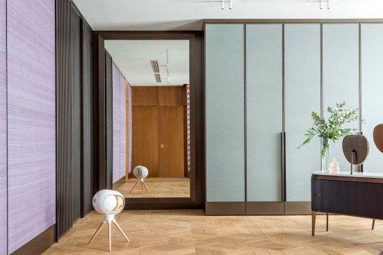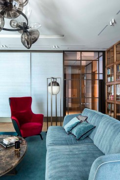 In the living room, the bright furniture stands out against the pastel walls: a sofa by Flexform and sophisticated blue shades couch and an expressive scarlet armchair by Poltrona Frau. The geometric shape and vertical direction of shelves and minimalist sliding elements are balanced by the flowing shapes of upholstered furniture and tactile textile. An extravagant Herling Berlin chandelier draws and holds attention, and the design is visually completed by a Promemoria floor lamp and a picture by Ukrainian artist Oleg Tistol.