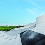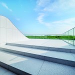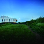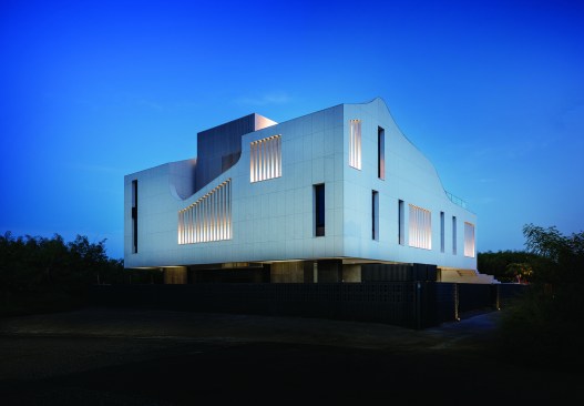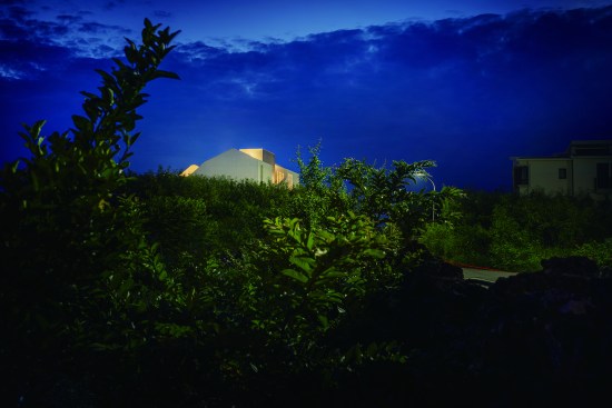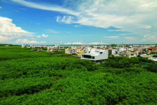 Consisting of three parallel stacked volumes, each with a distinctive roof profile, the Penghu house evokes an indigenous village cluster above the tree lines. The traditional slits-and-pillars openings are reinterpreted as balcony and patio screens, behind which are floor to ceiling glass doors for greatly improved natural lighting and ventilation. The white stone cladding casts a strong contrast against the azure island sky and the surrounding green farmland.