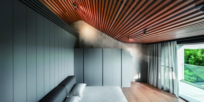 Effective natural cross ventilation is built-in throughout the entire house, even within the mechanical and duct conduits. This allows the house to enjoy natural breezes without the use of air conditioners even when it is 35˚C outside. The bedroom walls are rendered in natural clay to regulate humidity and prevent mold or fungal growth which is common on the island. Within, the rolling roofscape is lined with fragrant pine, giving the house a warm visual and olfactory signature. Wood cut-offs are also recycled into original furniture and screen for the house.