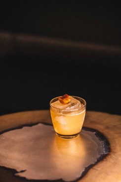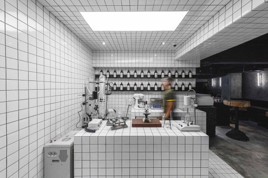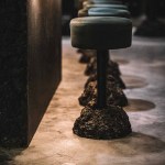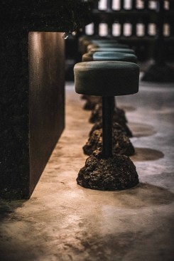 The focal point is the main bar, featuring a bar countertop which appears as if it was carved out of giant volcanic rock and is described as the ‘cockpit for bartending’ by founder Agung Prabowo, designed to fit all the needs for performative efficiency. The language of laboratory design is further explored through the customised displays behind the main bar. PENICILLIN’s bespoke bottles of cocktails and ingredients are fixed onto the wall with a laboratory clamping system.
