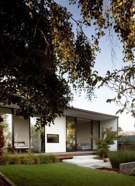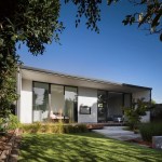 The rear half of a formerly unremarkable ranch-style bungalow in San Carlos, Calif., has been transformed by San Francisco–based Michael Hennessey Architecture to meet the desire of a young family to live seamlessly between the indoors and out. An addition built into the existing backyard replaces the original façade of small windows and doors with a south-facing, wide-eave modern box structure with floor-to-ceiling glazing that opens the master bedroom and family room to the outdoors.