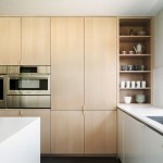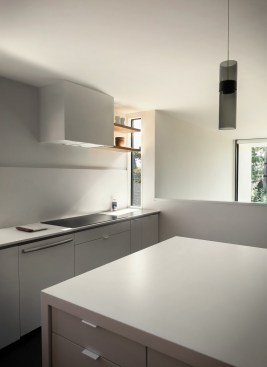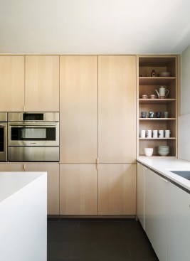 A minimal palette keeps the design’s focus on space and natural light. “Light oak veneer cabinetry brings subtle color to the kitchen while remaining consistent with the lighter material palette of the walls and countertops,” Hennessey says. Gray tile flooring provides thermal mass for passive heating and cooling, while providing a practical surface for everyday use—and, with time, the new exterior ipe wood decking will weather to match the tile in color.—E.K.