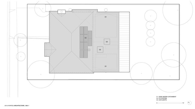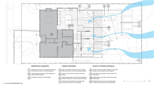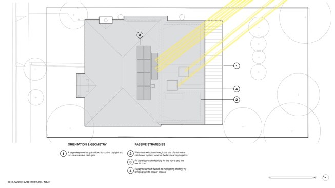 The client’s desire for enhanced outdoor living is met by well-defined areas for a patio, vegetable garden, chicken coop, and lawn. The site’s large, existing trees were maintained to provide shading for the backyard and the new addition. The old house’s hipped roof is used for photovoltaic panels that provide electricity for the home and the client’s electric car. The new roof—which is flat—employs a rainwater catchment system to provide irrigation for the landscaping.