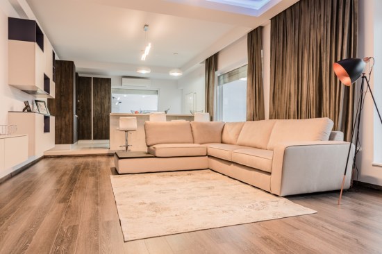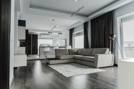 To create a unique design of the apartment, the designers used a dark-white paint for almost all walls in the apartment. The dark wood floor of all the main rooms has been used for the elegance it offers to the spaces.