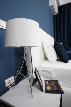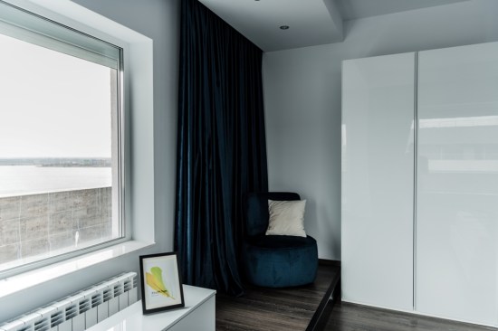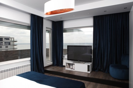 On the opposite side of the apartment is the master bedroom – with direct access to the master bathroom. For the main bedroom the accent color used – dark blue – is an elegant color, which we will find both on the wall behind the bed, on the armchair located near the window but also on the velvet drapes.