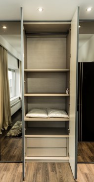 The first bedroom of the apartment was also designed in a modern style. For this bedroom, the designers chose a very large dressing room, with brown mirror doors and a double bed. Bedside tables – one with 2 drawers and one round table type; as well as the dresser with drawers, give the color accent to this room – fabric.