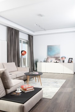 The color scheme for the living area is based on shades of gray, beige and white – perfectly combined with natural textures, such as concrete and wood.