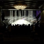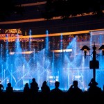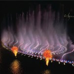 Beneath the placid surface of the lake, the water feature houses of over 370 water nozzles and shooters, 1,540 individually controlled colored lights and seven imposing fire experiences. The array of gestures, light, color, and the simplicity of the layout allows for a choreographic masterpiece capable of expressing a complexity of moods, rhythms and emotions ranging from delicate variations to surreal moments to dramatic and arresting events. This enables the fountain to interpret and perform to a breadth of musical styles. From lyrical sweeps to the robust precision of vertical jets, its water elements arise from the basin to capture both the subtlety and grandeur of the music they accompany. The addition of color through programmable lights washes the movements in another layer of emotion. Bursts of fire punctuate the choreography during passionate phrases, adding a primal heat, light, and immediacy to the experience. The selection of musical works chosen by Mr. Wynn for the fountain’s performance ranges from classical pieces to popular music and Broadway show tunes. The result is a rich and dynamic collection of performances in water, light, color and fire, each unique and expressive of its own musical character.
