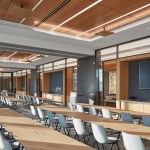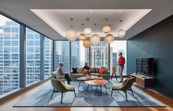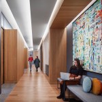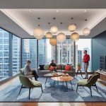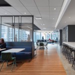 Staying in line with their vision to have an open and engaging work environment, all offices are within the interior of the floor plan, and there are no corner offices. Doing so allows more opportunities for collaboration and break-out spaces on the exterior with views of the Chicago cityscape and lake views. A large cafe and lounge flood with natural light offers spaces for communal lunches, brainstorms, and events.