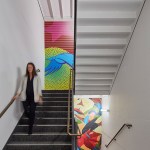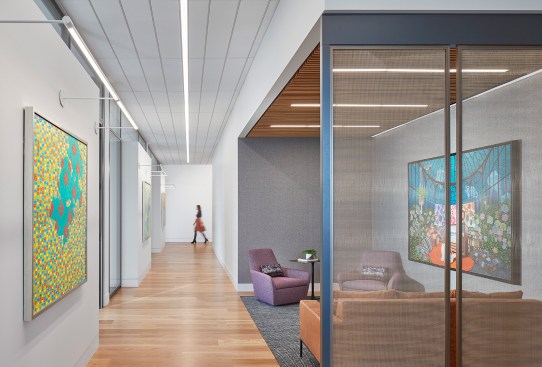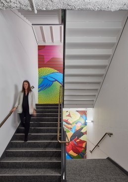 Perkins Coie engaged NELSON on environmental graphics to celebrate connections to the local community. For instance, the stairwells are carpeted and include a large black and white graphic signage that is synonymous with the ‘L’ train system. Art from local diverse artists is carefully curated throughout the office highlighting the richness of talent and diversity in the city. The use of glass walls at offices and meeting spaces demonstrates the sense of connection and transparency of the organization. The biggest differentiator is the natural light coming in and the “crispness” that it brings because of the cleanliness in the design, as well as the color palette. Playing upon the strong connection to Chicago, the office includes floor-to-ceiling windows with striking views of Lake Michigan—an important placemaker and moment of pride for staff and visitors.
