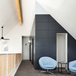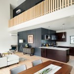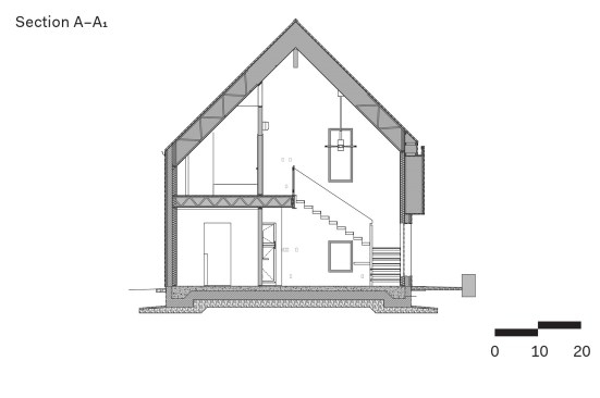 The residence’s dark exterior contrasts with a light interior lined in white walls and wood accents. A double-height living and dining area is anchored by a CLT-and-solid-glulam stair; shaded windows offer south light with minimal heat gain.
