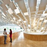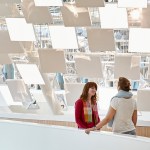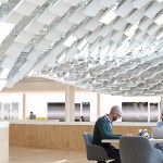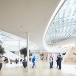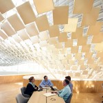 Staff and visitors are greeted in the central atrium by LAVA’s huge parametrically designed interactive light ‘tree’ comprised of 1500 ‘leaves’, hanging pyramidal panels suspended from the ceiling. The concept is of light filtering through trees.