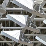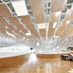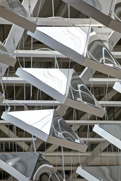 Covering the whole atrium ceiling the sculpture demonstrates the behaviour of light, both natural and artificial: reflection, diffusion and emission.