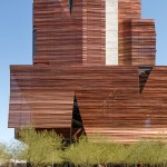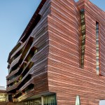 Similar to the education building, the newer biosciences structure is clad in folded copper panels, but its exterior, through pronounced setbacks and projections, presents a different physical interpretation of the tall, cleft, desert rock formations. Because the same team had conducted extensive studies, computer modeling, and mockups for the copper skin on HSEB, they were able to quickly apply their knowledge to the new building. “The process was easier this time by taking advantage of newer software,” says Arnold Swanborn, AIA, LEED AP, Associate Principal at CO Architects. “Grasshopper and Rhino allowed us to design the undulating copper panels’ complex geometry in record time.”