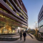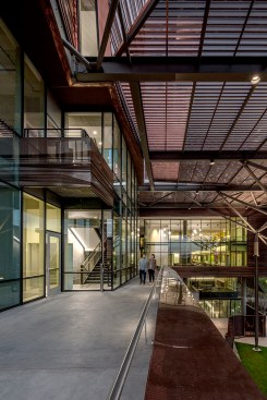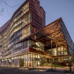 The LEED Silver-certified building institutes various sustainable features, such as copper paneling made of 95% recycled materials, passive orientation, cascade air supply system, chilled beams in labs and open offices, and LED lighting throughout the facility.