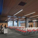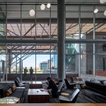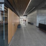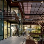 At the northwest corner of the building, researchers and industry representatives meet on laboratory floors to exchange ideas in glass-enclosed two-story spaces designed with meeting rooms, lounges, and kitchenettes. A sheltering entrance porch on west side of the building faces the central campus green. Extending northward from the portion of the building containing lobbies, café, library, and meeting spaces—nicknamed “The Mixing Bar”—the entrance forms a sunshaded gathering space similar to an outside lobby. A linear gallery connects the lobby to the courtyard, and acts as a pre-function space for a multi-purpose meeting center able to accommodate groups ranging from 50 to 200 persons.