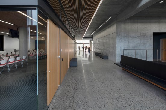 “The architecture of the Biomedical Sciences Partnership Building is similar to that of the Health Sciences Education Building in suggesting Southwestern geology through its horizontal striations and chiseled exterior,” says CO Design Principal Paul Zajfen, FAIA. “We wanted to introduce consistency and a strong sense of identity in this part of the campus by relating the two buildings.”
