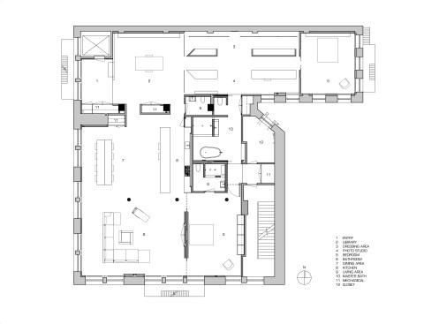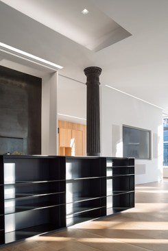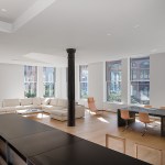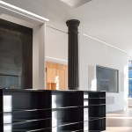 This industrial loft renovation was designed for a photographer seeking a serene live-work environment. The library/reception area immediately off the entry vestibule serves as a hinge for two distinct zones – the east zone flows directly into the ‘private’ domain of her photography studio and private bedroom, while the south zone flows into the ‘public’ domain of her kitchen, dining, and living areas. By cutting and folding the ceiling planes, light gently bounces throughout and anchors the seating areas. Functional raw steel, wood, and resin elements artfully shape the environment throughout.